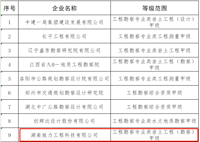 工程勘察专业类岩土工程(勘察)甲级资质由中华人民共和国住房和城乡建设部颁发,是岩土工程勘察类别的最高等级资质,市场准入门槛高,申报难度极大。本次甲级资质的成功升级,是对致力科技资信能力、人才队伍、技术实力、工程业绩等方面的充分认可,标志着公司可承接各种规模等级的岩土工程勘察业务,提升了公司作为工程勘察、工程咨询、试验检测、安全监测等多专业、多资质的品牌价值,为进一步拓展市场,发展工程全生命周期产业链提供了有力保障,为公司转型升级和高质量发展奠定了坚实基础。